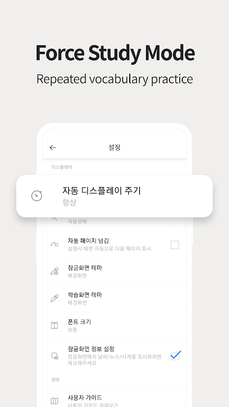Il vocabolario coreano di Lockscreen ti aiuta a migliorare il tuo vocabolario permettendoti di studiare il vocabolario coreano dai corsi delle scuole medie e superiori.