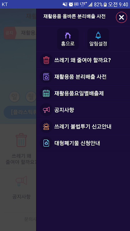 1. 재활용품 요일별 배출품목 알림 : 요일별 배출품목을 잊지 않도록 설정된 시간에 메시지로 알려주는 기능을 제공합니다.