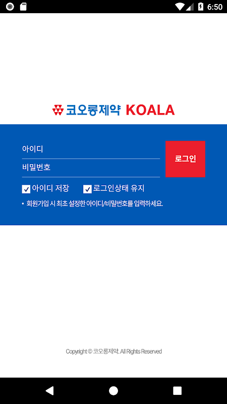 PC환경의 코오롱제약 KOALA (http://kolonpharma.hunet.co.kr)의 아이디와 비밀번호로 로그인 가능하며, 주요 서비스를 본 모바일 앱에서도 사용하실 수 있습니다.