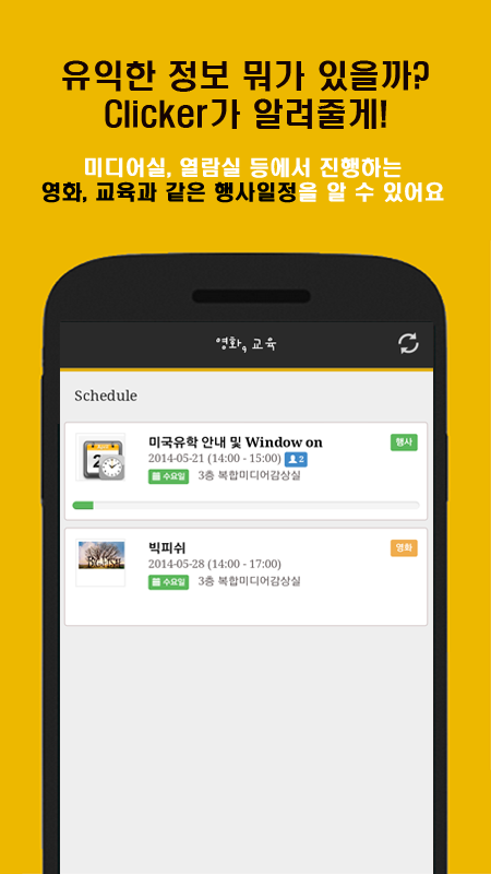 Clicker는 전자도서관 전체 시설관리를 위한 시스템 (Smart Library Management System) 으로서 Kiosk, PC, Tablet, Smart Phone등 모든 기기를 이용해 동일한 인터페이스로 열람좌석, 세미나룸, 멀티미디어룸, 사물함 등의 시설을 이용자와 연결해 주는 시스템 입니다.