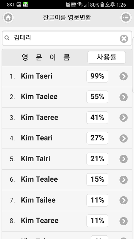 한글로 된 이름을 로마자(영문) 표기로 변환해주는 앱입니다. 현행 로마자 표기법을 따라 변환한 이름과 통계적으로 많이 사용되고 있는 로마자 이름도 함께 제안 받을 수 있습니다.