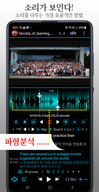 È uno studente di ripetizione della lingua per lo studio dell'inglese a ripetizione di sezioni facile e conveniente utilizzando la brillante potenza di controllo della forma d'onda di Ringdroid e la segmentazione automatica del parlato in unità di frase utilizzando FFMPEG.