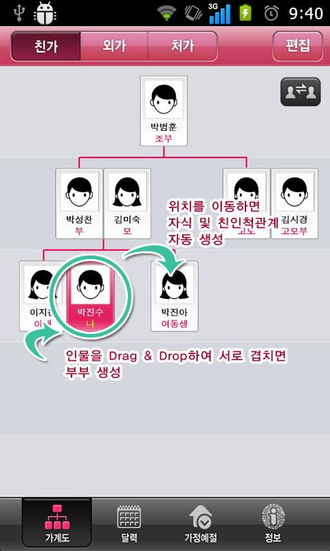 - 친가, 외가 처가, 시가, 처외가, 시외가 별 가계도 작성 및 나와의 호칭 정보 제공
