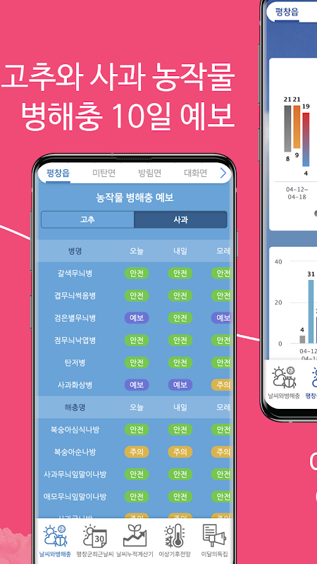 "Meteo a Pyeongchang-gun e parassiti e parassiti a Pyeongchang-gun" è stato creato con lo scopo di fornire informazioni settimanali sulla presenza di importanti raccolti e parassiti utilizzando dettagliate informazioni meteorologiche in ogni città e villaggio di Pyeongchang-gun.