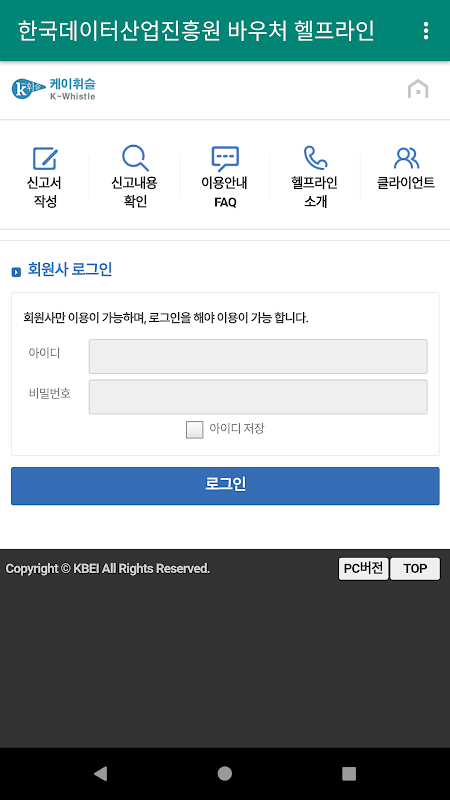 한국데이터산업진흥원 바우처 헬프라인은 해당 조직의 부정비리를 알고 있는 내부 임직원 혹은 외부 이해관계자가 안심하고 신고 할 수 있는 부정부패 신고 APP 입니다.