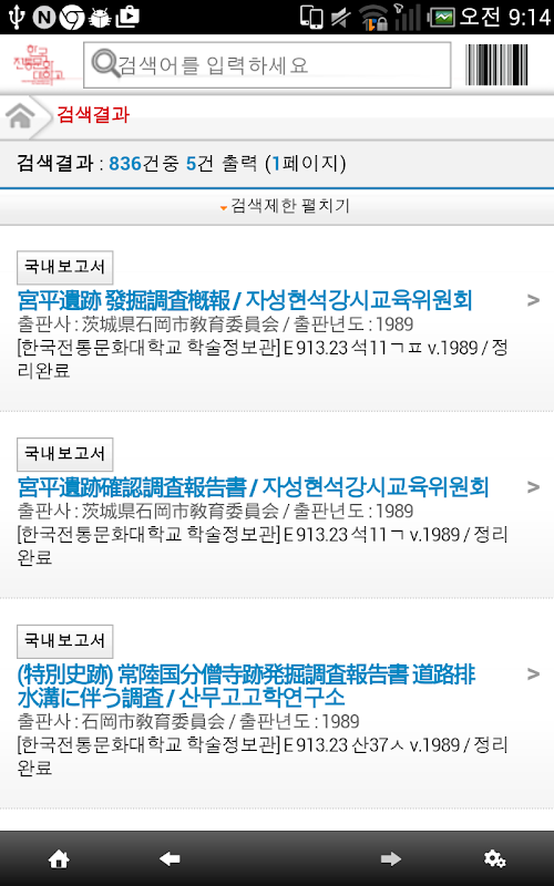 한국전통문화대도서관 모바일 전자도서관 서비스입니다. 모바일상에서 간단한 검색 및 도서관 서비스를 이용할 수 있습니다.