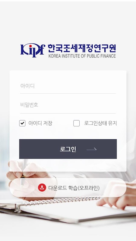 PC환경의 한국조세재정연구원 연수원 (http://kipf.hunet.co.kr)의 아이디와 비밀번호로 로그인 가능하며, 교육과정 안내/신청, 나의 강의실 등 주요 서비스를 본 모바일 앱에서도 사용하실 수 있습니다.