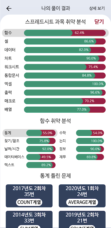 4) 풀이 통계 & 취약점 분석: 풀이 기록과 주제별 정답률을 한눈에 볼 수 있는 통계 그래프를 통해 취약점 파악 & 집중 공략