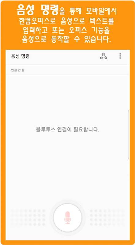 - 음성 명령 : 모바일에서 한컴오피스로 음성으로 텍스트를 입력하고 또는 오피스 기능을 음성으로 동작할 수 있습니다. 모바일과 PC는 QR코드를 통해 Wifi 또는 블루투스로 연결합니다.(한컴오피스 2018은 블루투스로 연결)