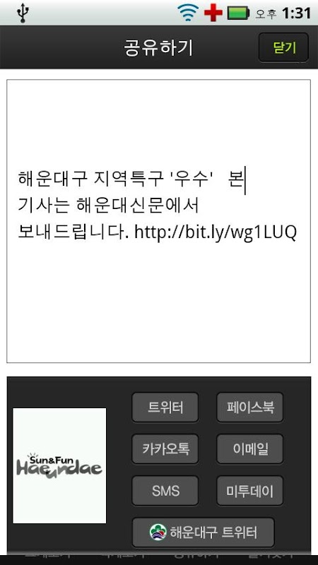 트위터 연동은 해운대구의 트위터로도 직접 연결되어 자신의 의견을 전달할 수 있습니다.