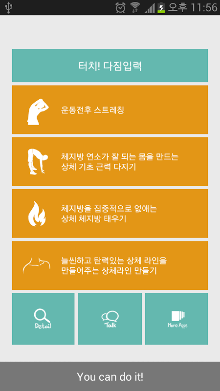 또한 운동을 상체 기초근력 다지기, 상체 체지방 태우기, 날씬한 상체라인 만들기 3가지의 단계로 운동을 구분하였고 사용자가 원하는 운동을 선택할수 있으며 운동시 자세설명은 물론 어플의 카운팅소리와함께 운동할수있습니다.