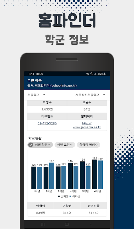 교육부에서 제공하는 데이터에 기반하여 선택한 아파트 주변 학군 정보를 제공합니다. 뿐만 아니라 학교별 각종 현황도 그래프와 표로 쉽게 확인할 수 있습니다.