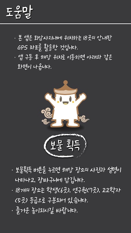 경기도 양주시에 위치한 양주 회암사지(사적 제128호)에서 GPS를 이용해 보물의 위치로 이동하며 보물찾기 활동을 할 수 있는 앱입니다.