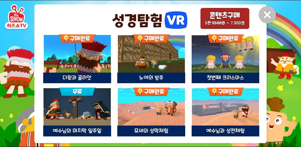 (VR Bible Exploration) comprende Davide e Golia, l'Arca di Noè, il Primo Natale, la Crocifissione, l'Esperienza del Tabernacolo e l'Esperienza del Tempio. Attraverso l'animazione della Bibbia Hiss Show, i personaggi della Bibbia che sono già familiari ai bambini prendono vita davanti agli occhi dei bambini con contenuti VR. I bambini possono partecipare alle scene della Bibbia ruotando lo sguardo di 360 gradi e possono rispondere alle situazioni in VR con un clic dello sguardo.