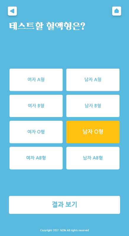 남자의 혈액형, 여자의 혈액형을 선택 후 결과보기버튼을 터치하면 서로간의 궁합이 표시됩니다.