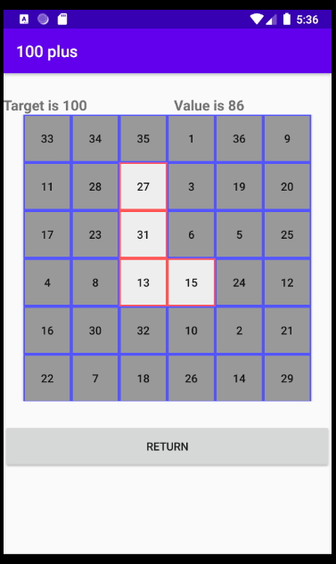 - If target value is 100, need to select another values(boxes) to reach 100 by moving up/down/right/left on your screen.