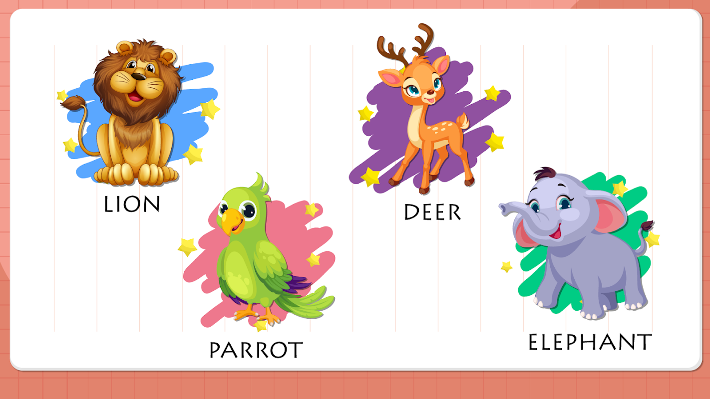 In questa app abbiamo aggiunto diversi concetti come Numeri, Alfabeto maiuscolo e minuscolo, Colori, Forme, Frutta, Verdura, Veicoli, Professioni, Animali.