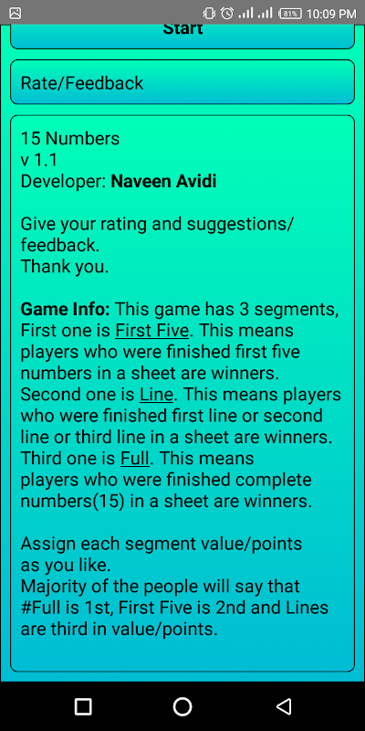 In this game each sheet will allocate for each player. And each sheet contains 15 numbers. A dice is placed on top of the sheets. There are 90 numbers (1-90) in the dice. When you clicked on the dice, the result number will be checked throwout the players sheets whether that number is in his/her sheet. If found white color applied to the number in the sheet. In this way who completes the complete sheet are winners. More info can be found in game's main screen.