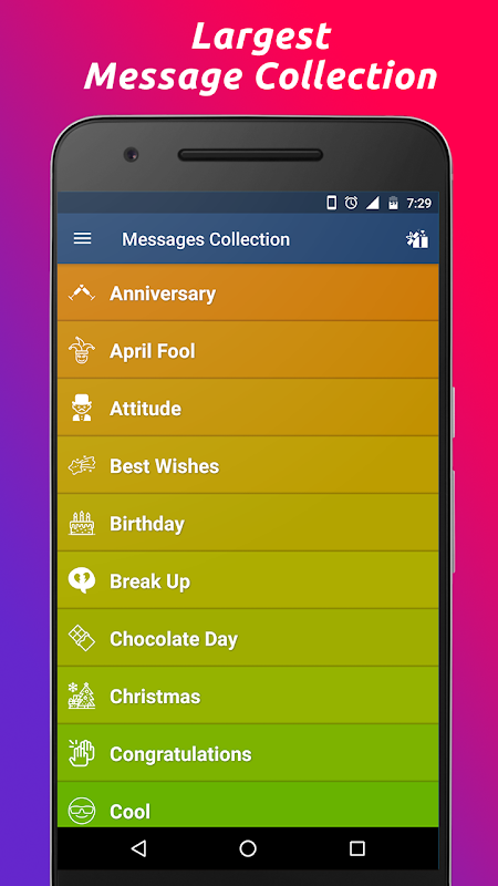 "175000+ messaggio Collection" app consiste categorie Messaggio dall'amore alla disgregazione, COMPLEANNO a CORDOGLIO, buongiorno a GOOD NIGHT, Festa della mamma per la festa del papà, mi dispiace GRAZIE, matrimonio anniversario, EID di Diwali, CAPODANNO al Natale e molti altri. L'applicazione contiene più di 42+ categorie e aggiunta più di giorno in giorno.