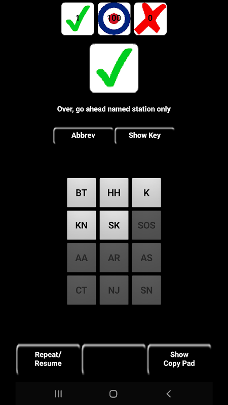 Durante l'utilizzo del Copy Pad, è possibile ricevere una stringa di caratteri del codice Morse e scrivere nello spazio bianco con il dito o lo stilo. Dopo che la stringa è stata presentata, l'app si ferma brevemente per consentirti di verificare automaticamente la tua precisione. Lo spazio bianco viene quindi cancellato automaticamente e viene riprodotta una nuova stringa di caratteri. Puoi modificare la lunghezza della parola da 1 a 10 caratteri. Il Copy Pad NON tenta di riconoscere la tua calligrafia. Se utilizzi una tastiera esterna, allora l'app confronterà la stringa scelta con quella che hai digitato, visualizzando in rosso i caratteri errati e in nero quelli digitati correttamente.