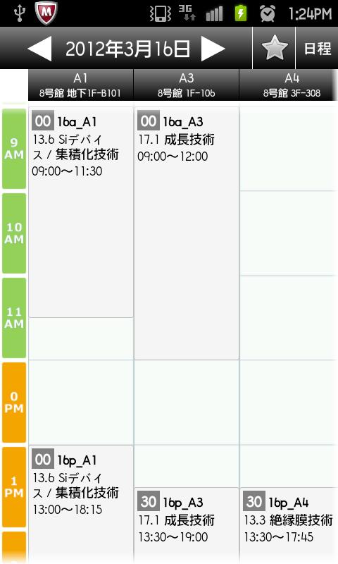 各セッションの開催時間と会場を一覧で確認できるタイムテーブル機能があります。