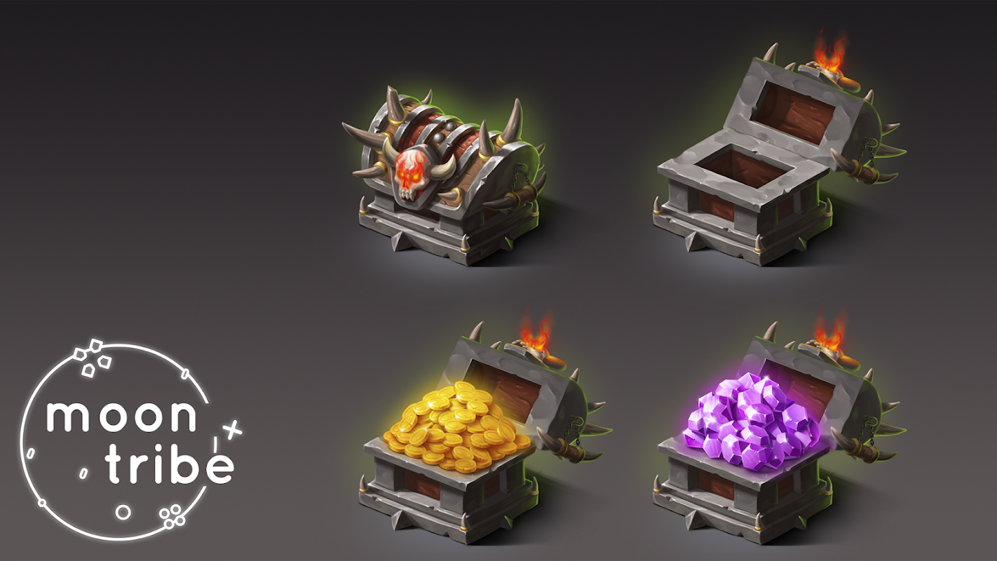 Hand-painted set of fantasy-themed 2D chests. AAA quality. High resolution. Demo scenes and previews. Everything set and ready for use.