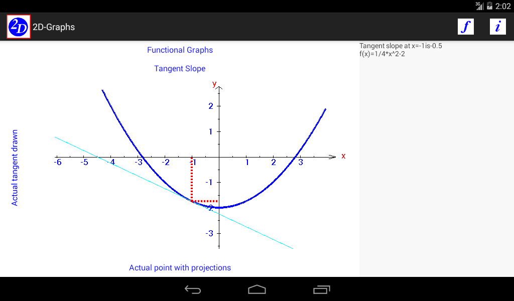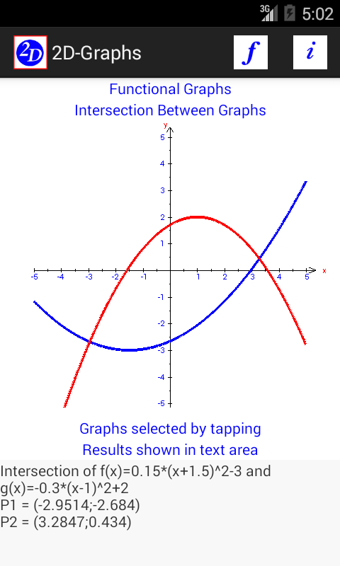 L'applicazione 2D-Grafici offre la rappresentazione grafica di grafici funzionali del tipo f (x) o (x (t), y (t)). Esso comprende il calcolo di intersezioni, zeri e estremi. Una specialità è lo sviluppo della definizione solidale ad un certo numero di metodi. Tra questi sono somme superiori e inferiori, trapezio metodo Simpson, mostra un'approssimazione del valore integrale. Inoltre, la zona betwenn due grafici può essere calcolato. Per ogni grafico, si può definire una posizione in cui il programma calcola la pendenza e disegna la relativa tangente.