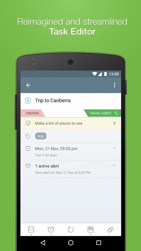 • Creare semplici compiti, o liste di controllo e progetti con sotto-attività. Le attività possono avere note ricche con markdown, allegati e più allarmi.