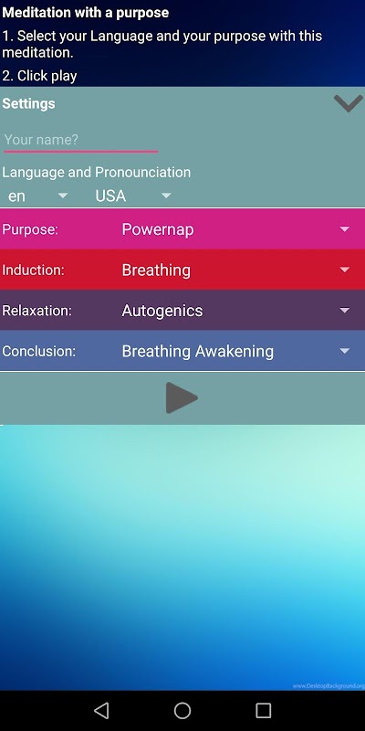 A wide variety of personalized relaxation scripts can be created using this app. You can choose any induction, relaxation, and conclusion from the dropdown boxes to meet your needs.