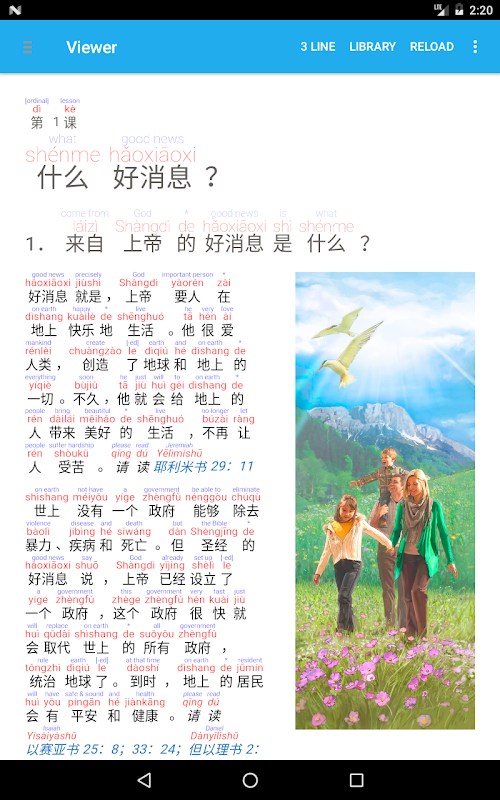 Importare file ePub che si trovano nella semplificato o tradizionale cinese e poi li hanno convertiti per aggiungere una linea di romanizzazione (pinyin, Sidney Lau, Yale), e una linea di lingua madre (inglese, spagnolo). Il documento può quindi essere convertito in PDF. E 'anche possibile copiare il testo cinese e incollarlo in app. Inoltre, è possibile copiare un URL dal browser web Safari, e incollare l'URL per tirare su l'intera pagina web in app e quindi convertirlo in 3 linee.
