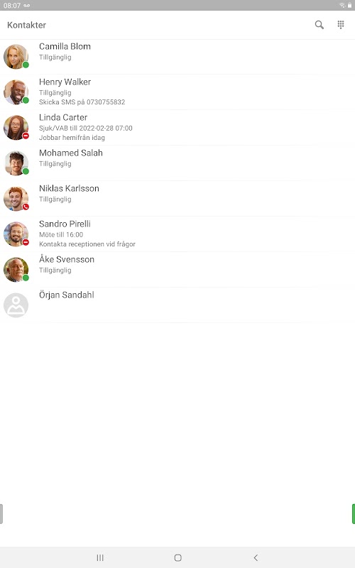 Nell'elenco dei contatti di 3Växel puoi cercare e trovare tutti i colleghi dell'azienda e vedere se sono disponibili per le chiamate. Da qui puoi anche effettuare, collegare chiamate, chattare, inviare SMS o inviare e-mail.