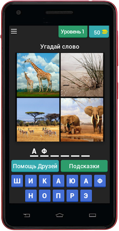 In ogni livello, si vede 4 foto (foto). Hai bisogno di indovinare una parola che li collega insieme. Per la risposta che si ottiene più monete. Questo è molto eccitante!