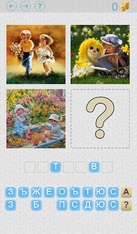Изначально открыта только одна фотография. Чем меньше картинок вы откроете, тем больше монет получите за отгаданное слово!
