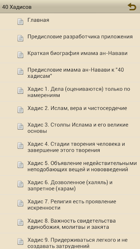 Assalamu alaikum va rahmatu Allah varakatuh miei cari fratelli e sorelle musulmani! Lode ad Allah, per la cui misericordia è stato completato il lavoro su questa applicazione. Questa applicazione ti darà l'opportunità di conoscere meglio i 42 hadith che l'Imam al-Navawi ha scelto una volta per il suo libro, che Allah abbia pietà di lui.
