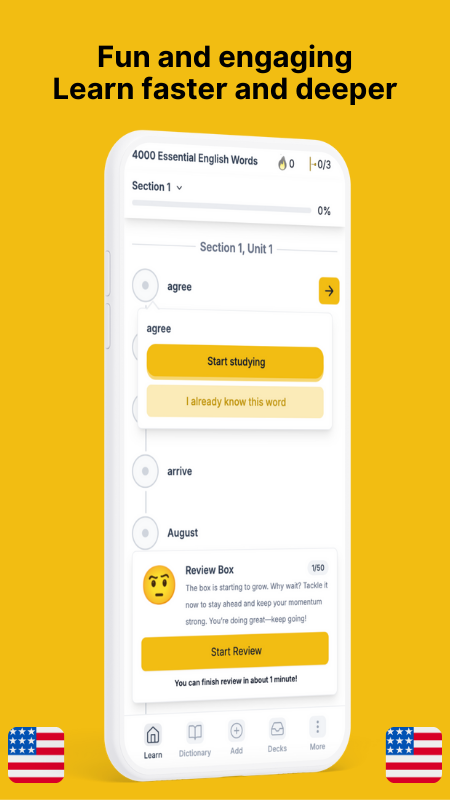 Inizia dalle parole base e avanza gradualmente. La struttura dell'app ti permette di apprendere al tuo ritmo mentre tieni traccia dei progressi.