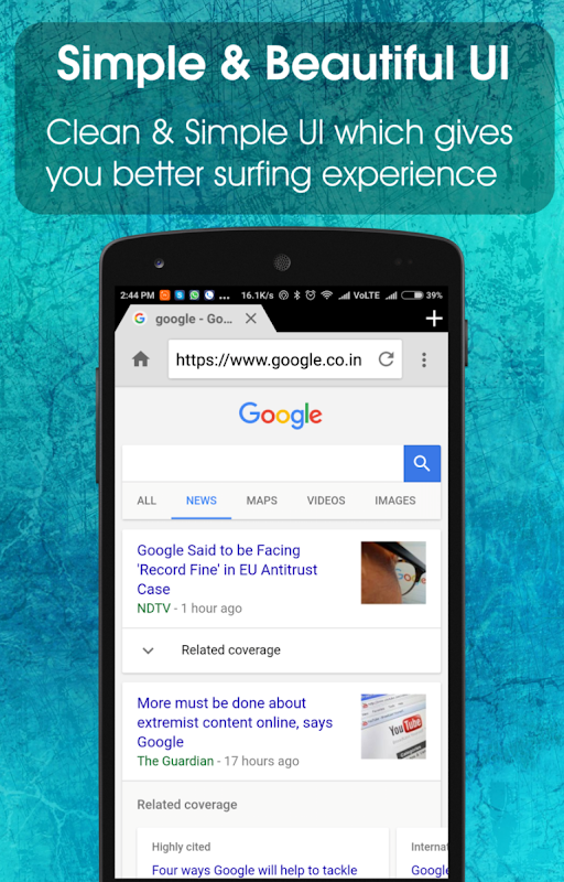 Light-weigh: Browser is smaller than 4MB and doesn’t load your device’s memory (RAM),your device runs smoothly.
