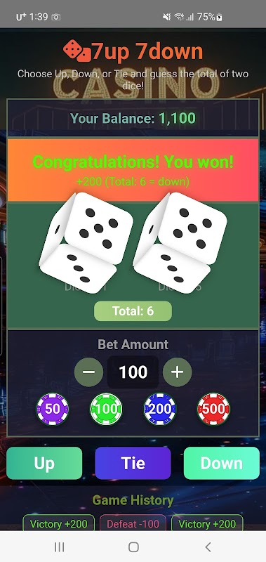 "7 Up 7 Down" è un gioco in stile casinò veloce e facile da capire in cui i giocatori devono prevedere la somma di due dadi. L'idea di base è semplice: si sceglie se il totale sarà maggiore di 7 (Up), minore di 7 (Down) o esattamente 7 (Tie). Questo gameplay semplice lo rende popolare negli ambienti di gioco casual e nelle piattaforme di casinò online.