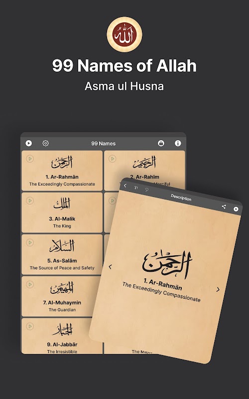 Scopri la bellezza e il significato dei 99 Nomi di Allah con la nostra app completa, progettata per approfondire la tua connessione con l'Onnipotente. Questa app islamica è un must per i musulmani di tutto il mondo, poiché ti offre la possibilità di leggere e ascoltare i 99 nomi di Allah insieme ai loro significati.