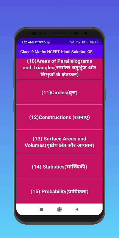 This 9th गणित NCERT हिन्दी हल OFFLINE app provides solutions In Hindi of all chapters of class 9th NCERT Maths Textbook. This app is very easy to use.