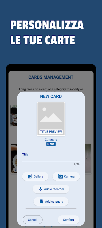 Le carte sono personalizzabili con un titolo, un'immagine e un audio e potrai assegnargli una categoria creata da te. Una volta create, potrai successivamente modificarle o eliminarle dalla sezione Gestione carte.