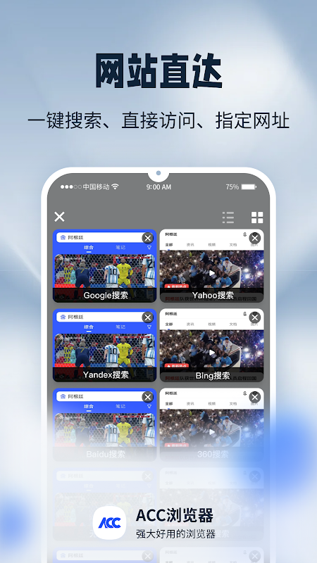 ACC Browser è un browser di aggregazione, suddiviso in: aggregazione motori di ricerca, aggregazione tipologie di ricerca; contiene inoltre molte funzioni molto pratiche: record di accesso, record di ricerca, dispositivi simulati, intervallo temporale, accesso invisibile, ricerca invisibile