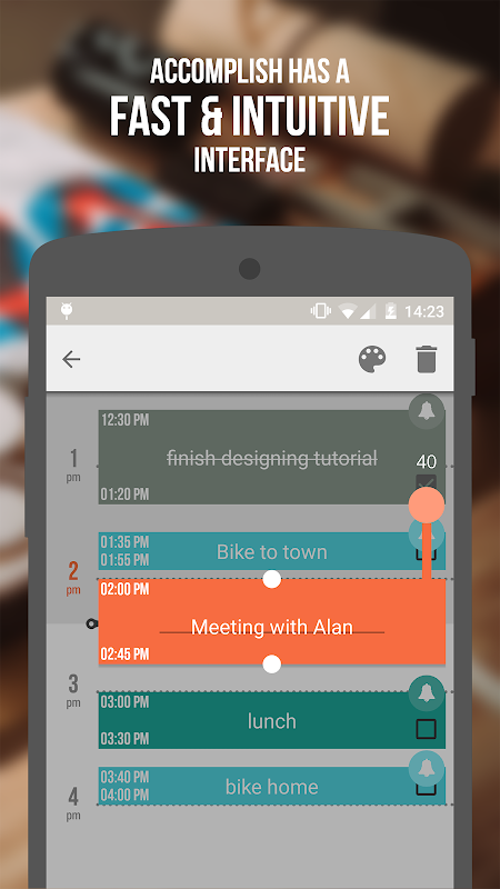 These two points capture the essence of Accomplish: plan, fast. Accomplish is a to-do list and time planner. It’s a tool for short-term time management. Accomplish isn’t built to let you schedule an event, share it with 4 friends who will comment on it and accept it, and make that event repeat twice a year on Wednesdays in August. No. for that you can use your calendar. Accomplish is here for small things. For planning out your time, your personal life, day by day. It's simple, and it's FAST.