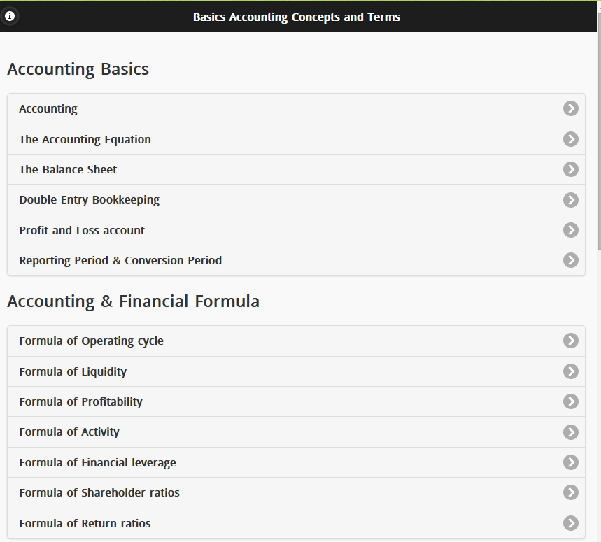 Nozioni di base Concetti di contabilità, termini e raccolta delle note di lezione. Questa app ti introdurrà ad alcuni principi contabili di base, concetti contabili e terminologia contabile. Alcuni dei termini contabili di base che imparerai includono entrate, spese, attività, passività, conto economico, stato patrimoniale e rendiconto finanziario. Acquisirai familiarità con debiti e crediti contabili e molti altri. Note tascabili per la contabilità. Deve avere un'app per gli studenti di contabilità.