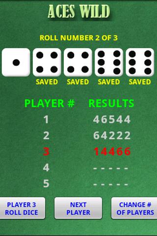 Aces Wild is a fun dice game where players roll five dice up to three times and try to get the best poker hand possible. Aces (ones) are wild and can be used as any other number. Dice can be saved at any time by tapping them. GOOD LUCK"