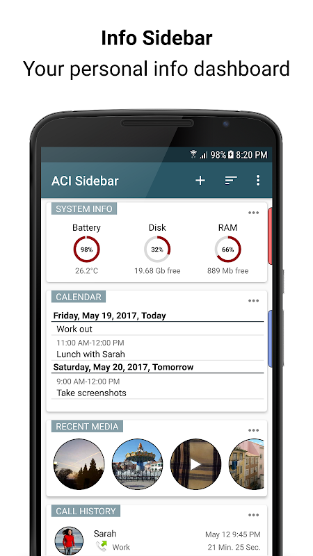 Aggiungere piccoli widget alla barra laterale e averli sempre a disposizione. Ci sono diversi widget che visualizzano informazioni diverse, per esempio un ordine del giorno calendario, un registro delle chiamate, foto e immagini. Personalizzare la barra laterale informazioni in base alle proprie esigenze.