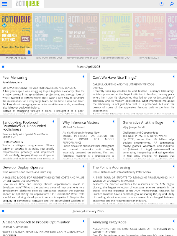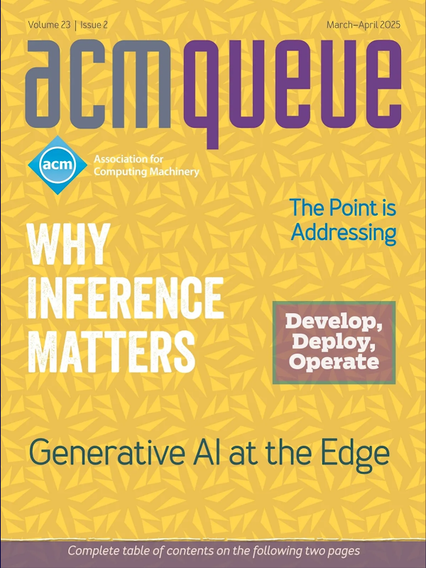 acmqueue è la rivista di ACM per gli ingegneri del software praticanti. Scritto da professionisti e sviluppatori di software per professionisti e sviluppatori di software, acmqueue si concentra sui problemi tecnici e sulle sfide che si profilano, aiutando i lettori ad affinare il proprio pensiero e a perseguire soluzioni innovative. acmqueue non si concentra né sulle notizie del settore né sulle ultime "soluzioni". Piuttosto, gli articoli tecnici, le colonne e i casi di studio danno uno sguardo critico alle tecnologie attuali ed emergenti, evidenziando le sfide e gli ostacoli che potrebbero sorgere e ponendo domande a cui gli ingegneri del software dovrebbero pensare. acmqueue è il modo migliore per fare pratica con gli ingegneri del software per stare al passo con il campo. Ogni numero bimestrale è ricco di contenuti solidi e ben fondati, sviluppati con l'obiettivo di tenere informati i lettori e guidare le migliori scelte ingegneristiche e di design.