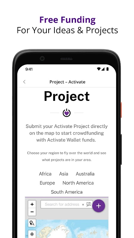Progetto - Una mappa del mondo in tempo reale che consente ai membri di pubblicare, visualizzare e finanziare progetti e idee di base con i fondi del Wallet. 5 miliardi di utenti di social media in tutto il mondo significano 50 miliardi di dollari in potenziali finanziamenti di base che livellano il campo di gioco economico globale.