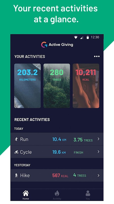 Utilizza l'app Active Giving per tracciare le tue corse o gite in bicicletta. Inoltre, inserisci il tuo ultimo allenamento e impara a fare del bene mentre sei attivo.