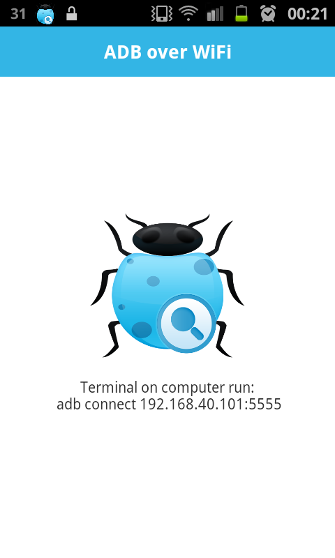 - After enabling ADB over WiFi, to connect your computer to the device open the Terminal (on Linux) or Command (on Windows) and run: adb connect ip_of_device:5555 or adb connect ip_of_device