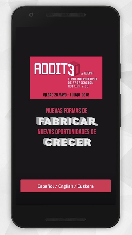 ADDIT3D 2018 se celebra del 28 de mayo al 01 de junio de 2018 avalado e integrado dentro del espacio expositivo de BIEMH 2018, Bienal de M-H, certamen muy vinculado a los fabricantes y distribuidores de los principales Sectores industriales, que aglutina la mayor concentración empresarial del Estado en Industria 4.0. y que cuenta con la presencia acreditada de más de 40.000 visitantes profesionales de los principales sectores tractores de la Economía mundial.